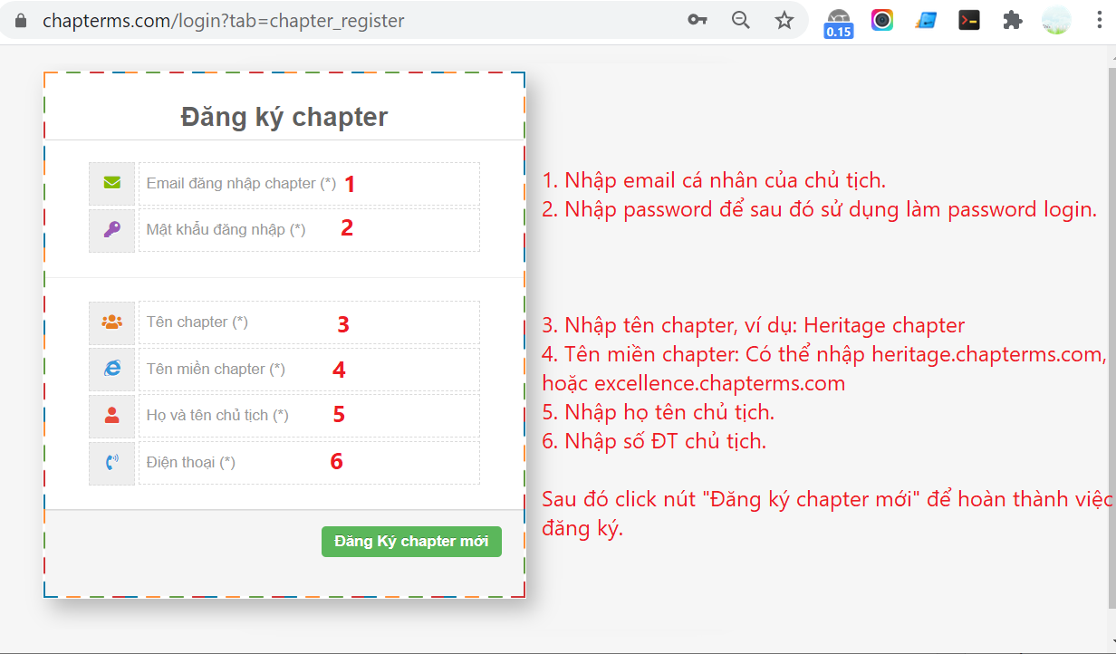 Lưu ý: Email và password này để sử dụng làm password login vào hệ thống quản lý chapter.