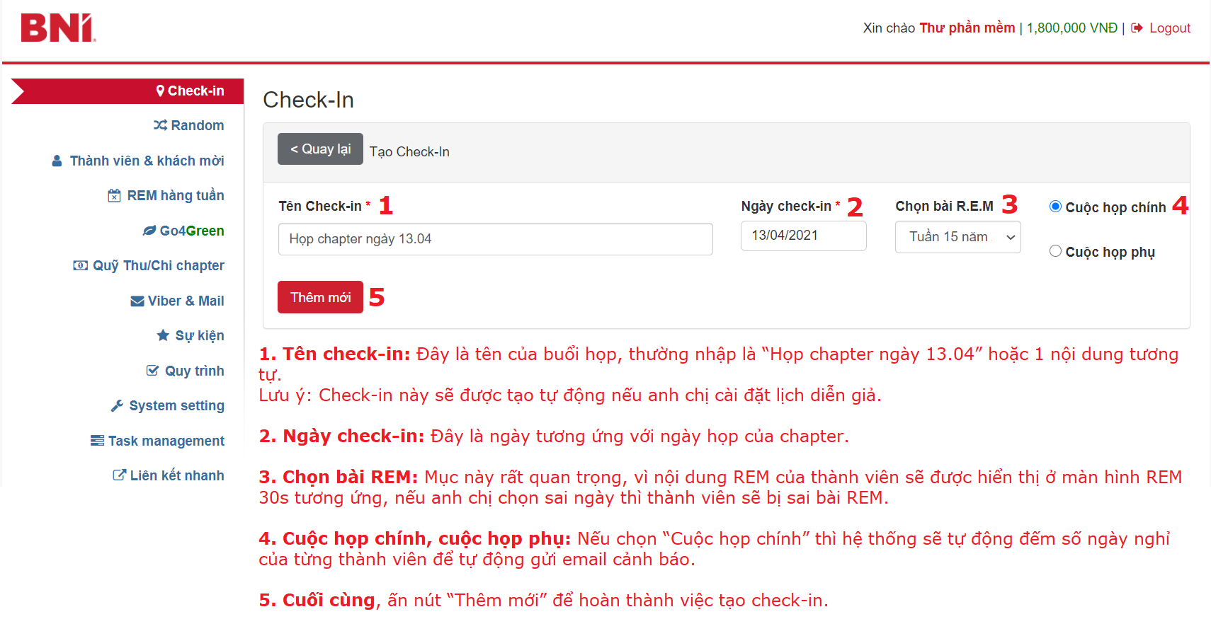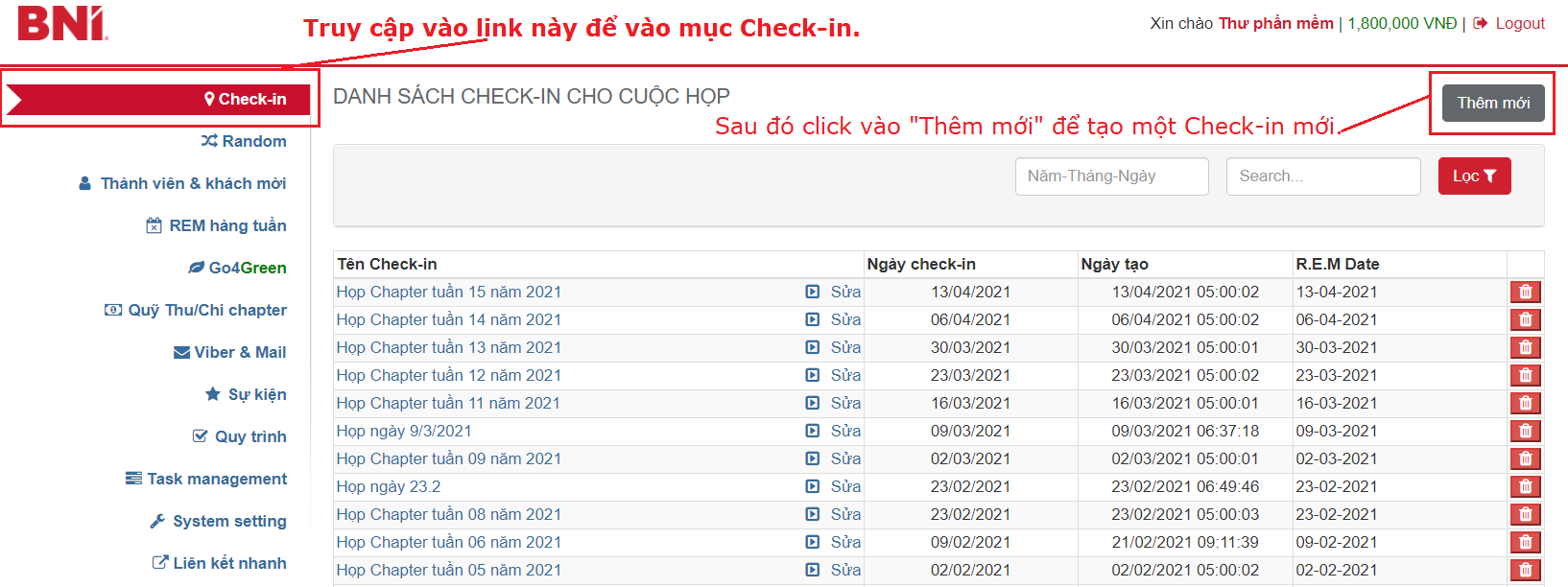 Để tạo 1 check-in mới cho buổi họp, anh chị vào menu “Check-in”.