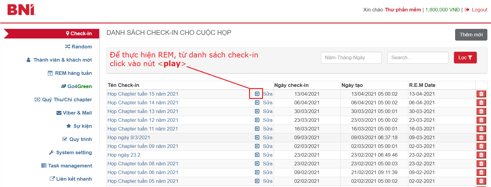 Từ màn hình danh sách các buổi check-in, click vào nút <play> để vào phần REM 30s:
